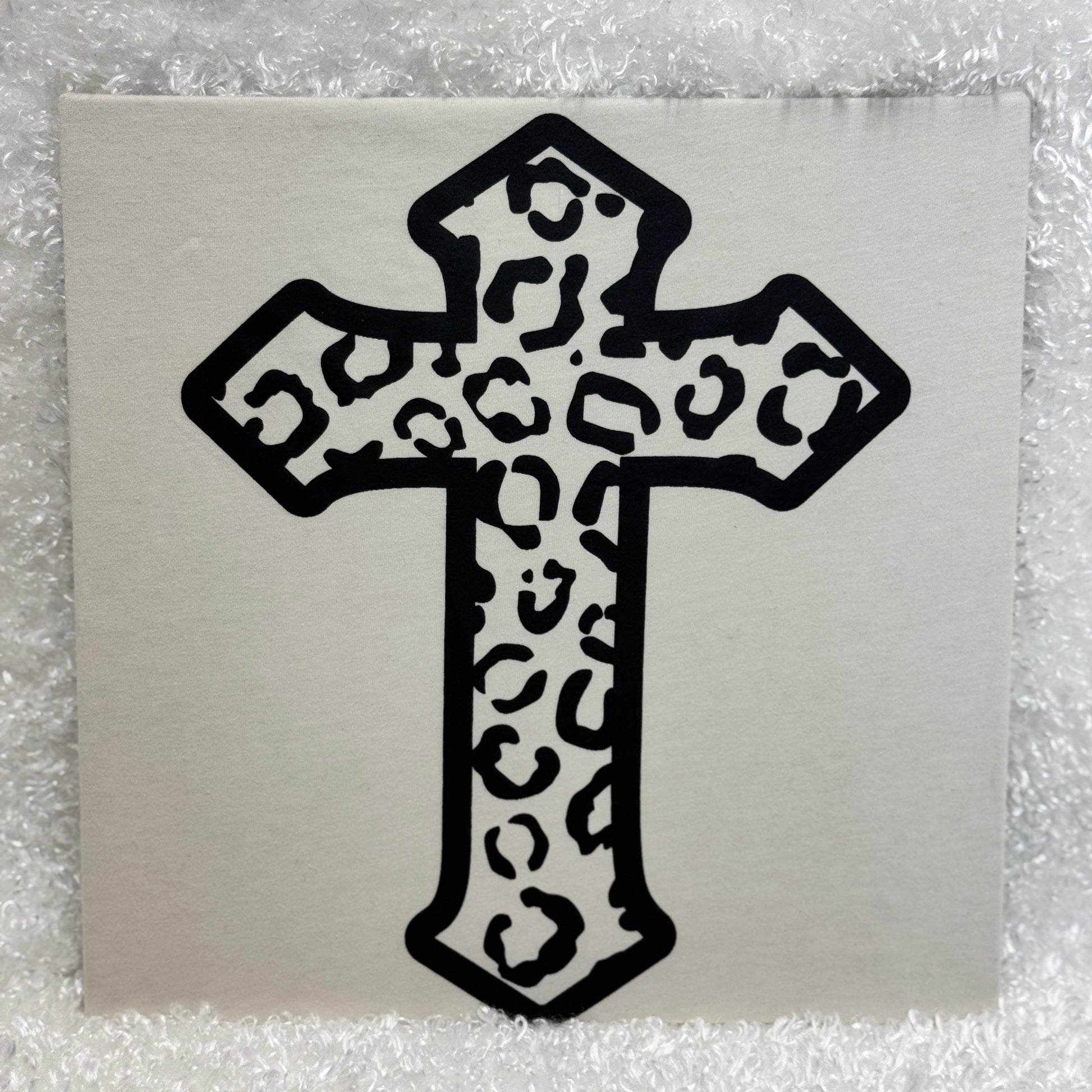 A bold twist on a timeless symbol — this black print design features a classic cross filled with cheetah print texture for just the right mix of fierce and faithful.